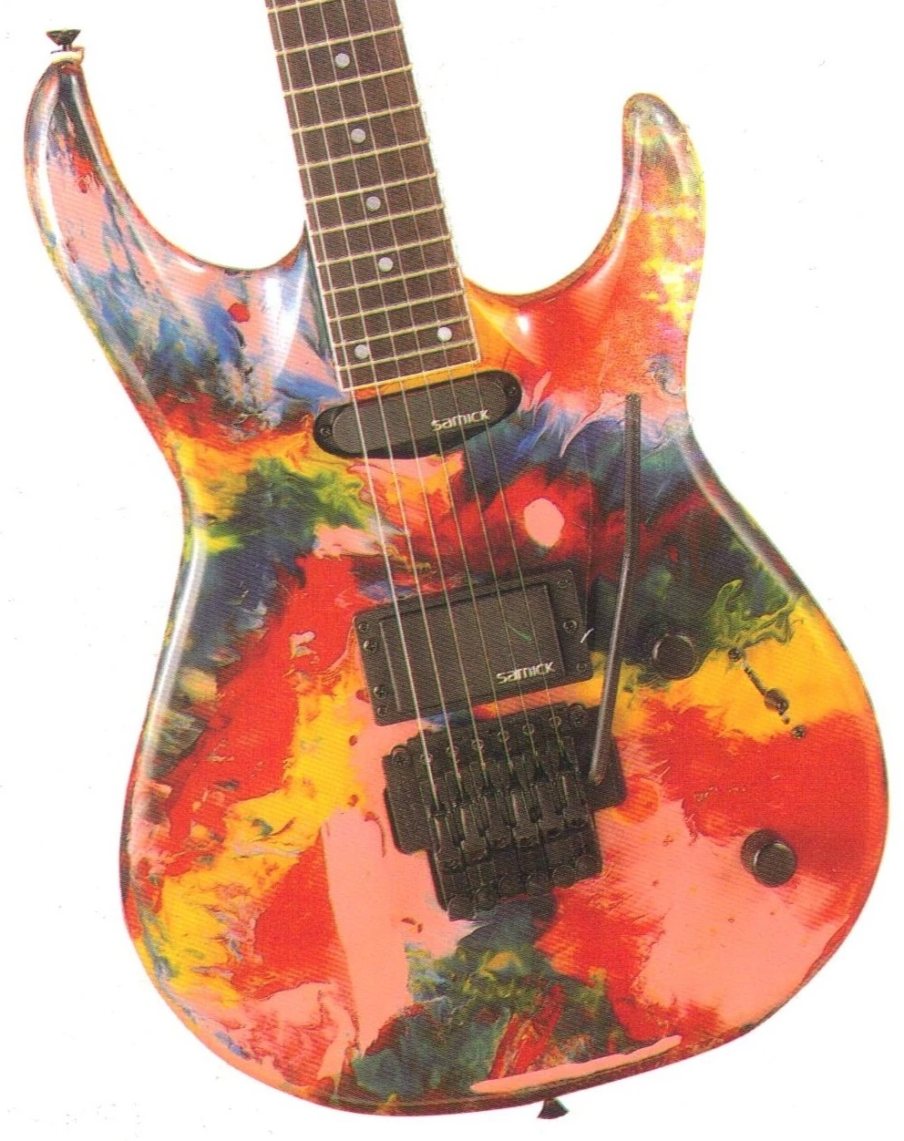 Starting around 1987, Samick began offering many unique "Graphic Paint" finish options. Because they were all painted by hand, no two are exactly the same. Some were even 3-dimensional (carved into the top). However, they are not necessarily rare, as just about any model could be ordered in a Graphic Paint finish.